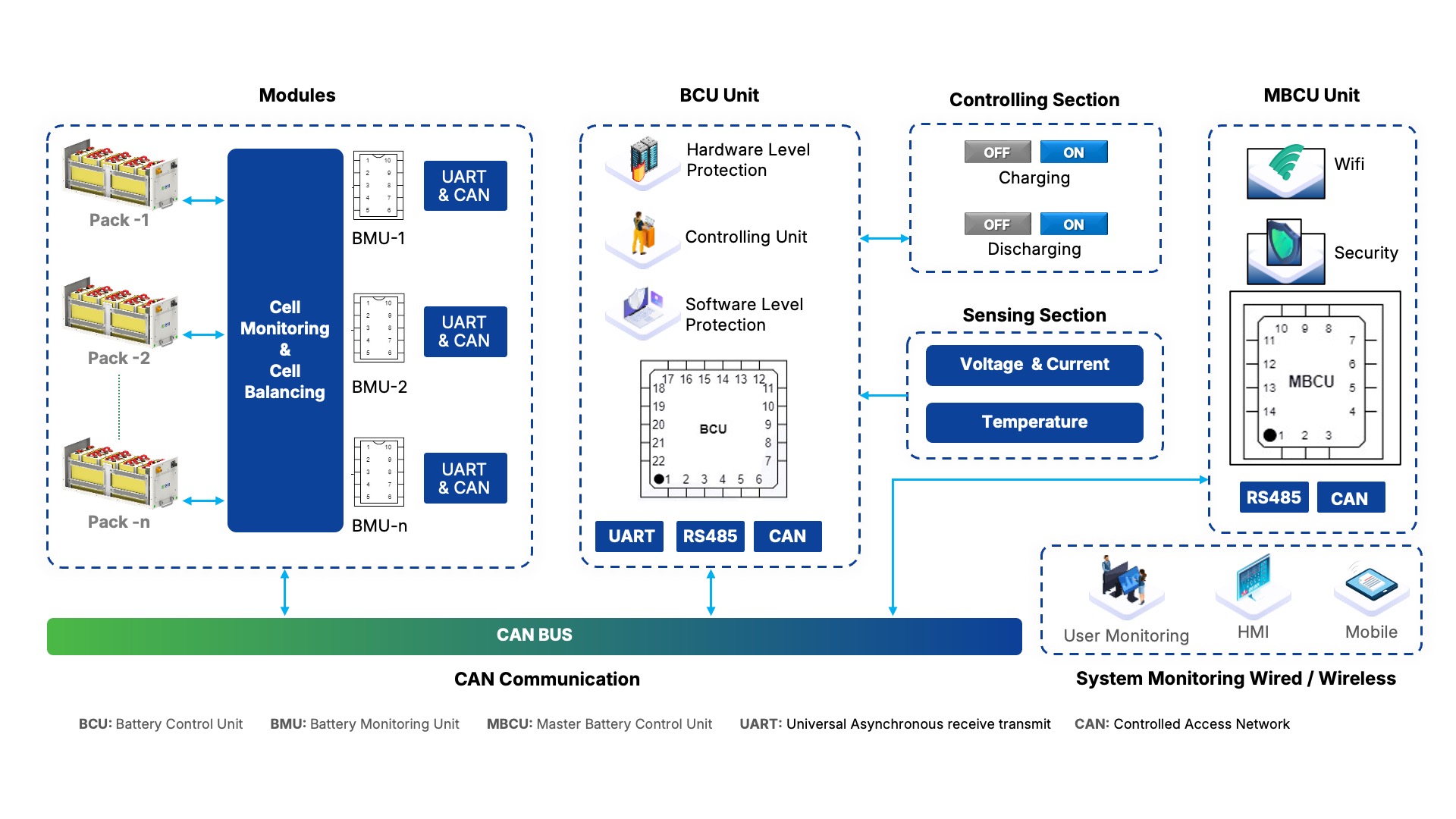 BCU communicates with all battery modules ( BMU1….n)